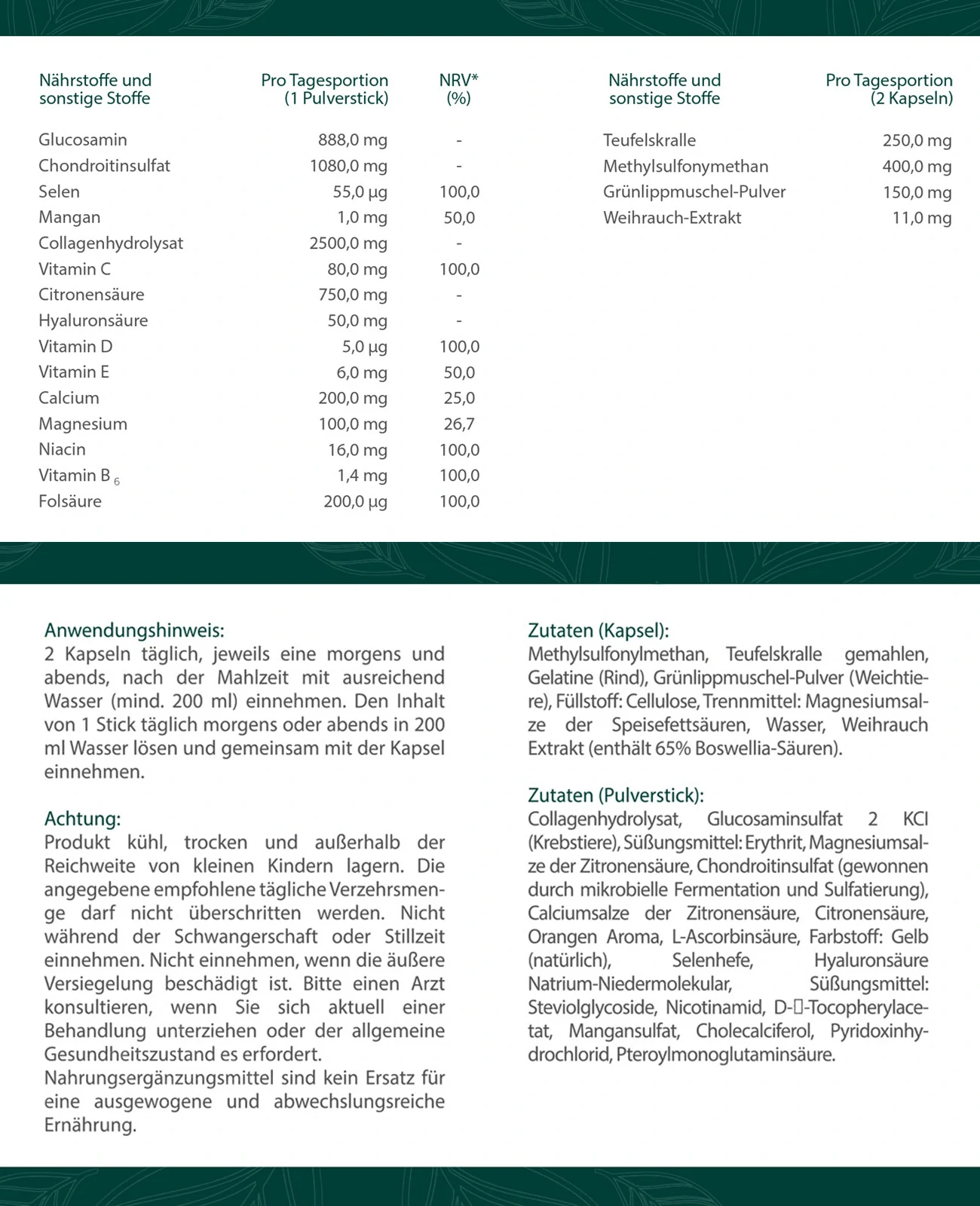 Die Rezeptur von vitaluvia Arthro Aktiv ist einzigartig und besteht aus 19 wertgebenden Wirkstoffen, die sich gegenseitig in ihrer Wirkung unterstützen. Die Formel besteht aus wertvollen Pflanzen- und Naturstoffen, die durch weitere Stoffe ergänzt werden. Vitamine und Mineralstoffe runden die Rezeptur ab. Die Kombination dieser wertgebenden und besonderen Wirkstoffe und die bestmögliche Unterstützung Ihrer Gelenkgesundheit ermöglicht vitaluvia Arthro Aktiv durch die gezielte Kombination zweier Darreichungsformen – Kapseln und Pulversticks – in einem einzigen Produkt.